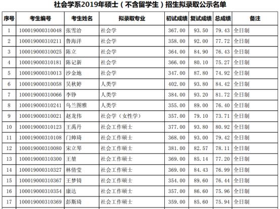 北京大学社会学系2019年硕士(不含留学生)招生拟录取公示名单