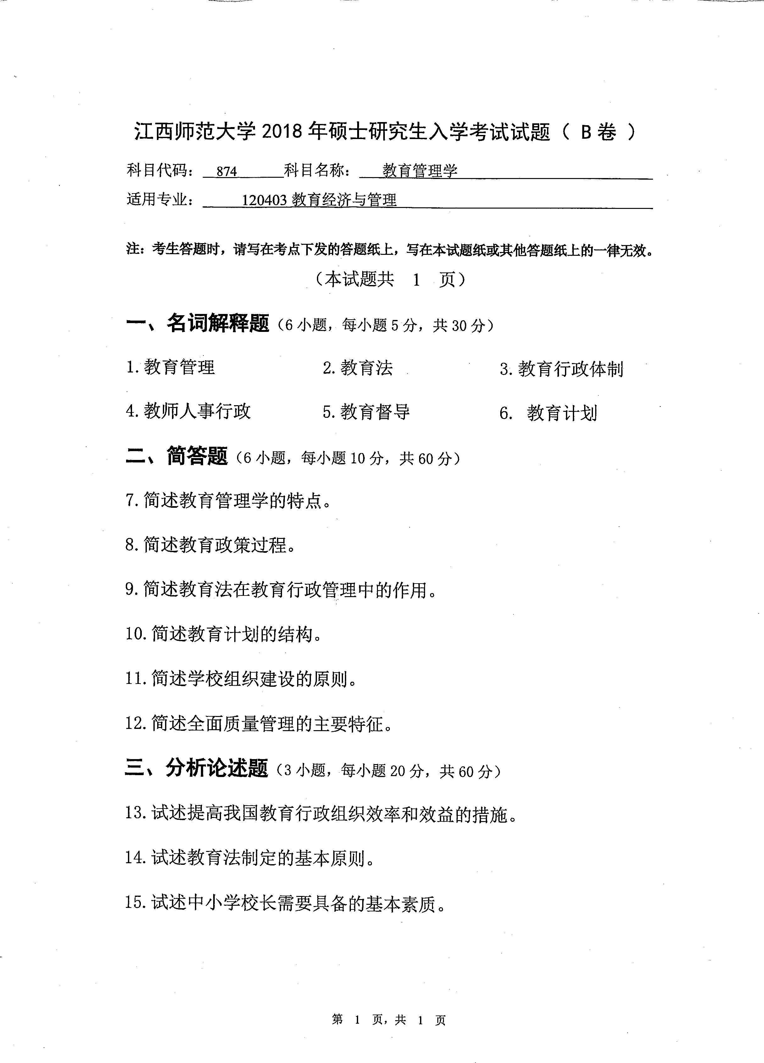 江西师范大学2018年874教育管理学研究生入学考试真题
