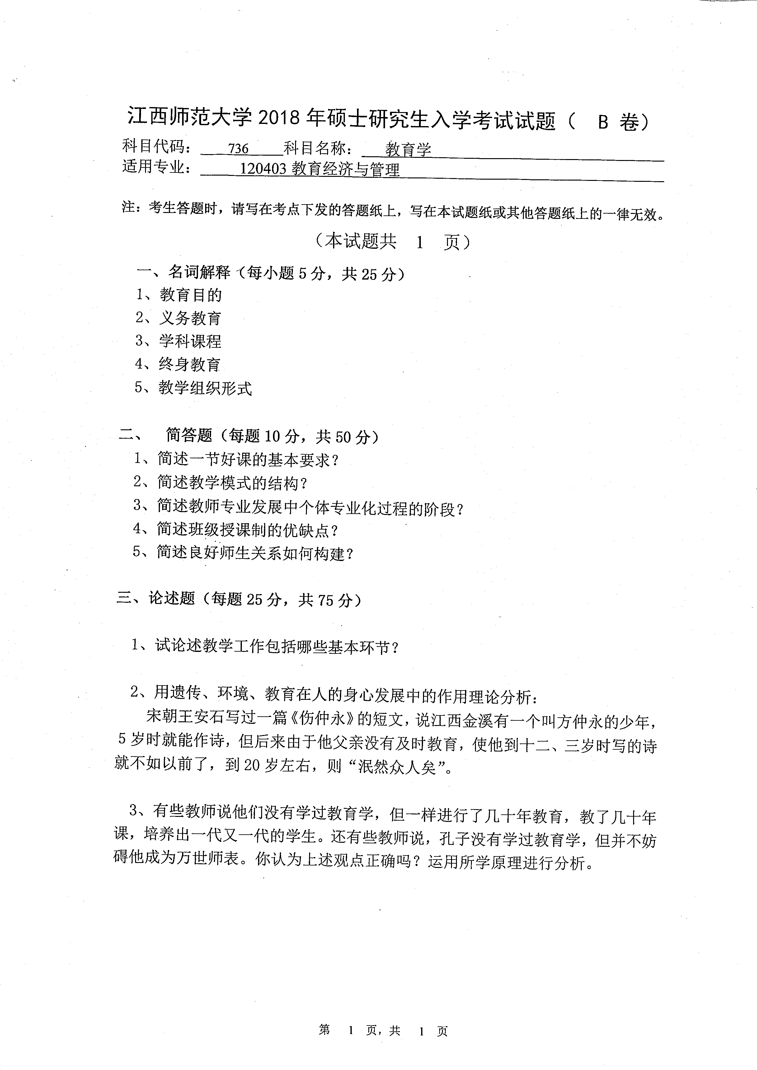 江西师范大学2018年736教育学研究生入学考试真题