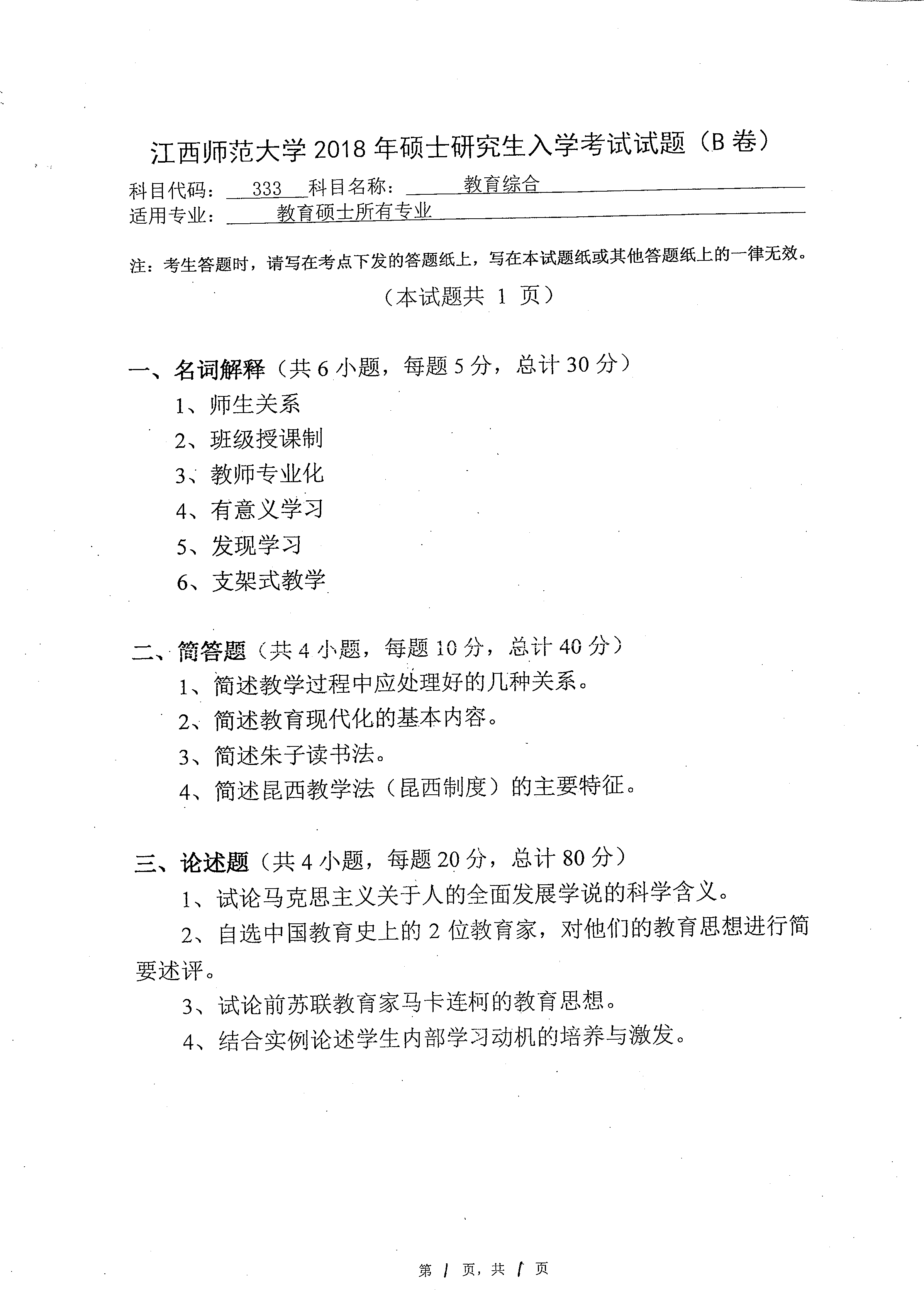 江西师范大学2018年777教育学专业综合硕士研究生入学考试真题