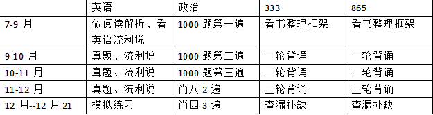 作息:按照你自己的作息来,记忆最好的时候用来背诵,困的时候看看英语政治。但是一定