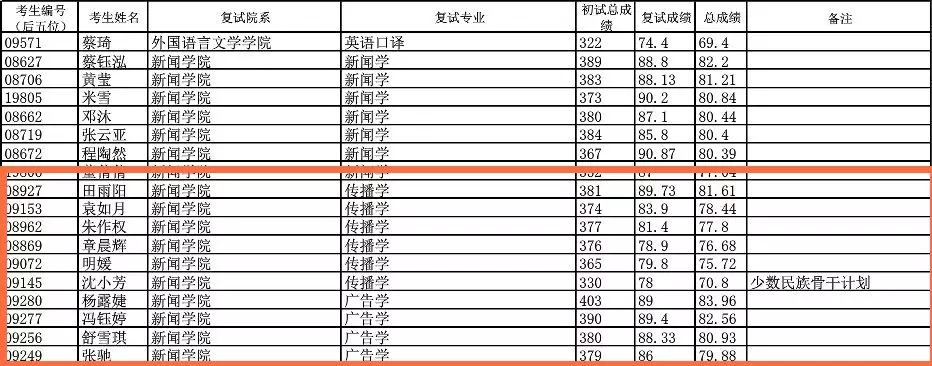 摘要:本文由新祥旭考研吴老师为大家详细解析复旦大学传播学考研情况,主要有以下几个板块:复旦大学传播学考研考试科目、研究方向介绍、本专业近3年复试分数线对比、本专业近3年报录比情况、本专业考研参考书目、往年录取名单及中国人民大学备考经验。 一、复旦大学考试科目 招生院系:新闻学院 招生专业:传播学(050302)(学硕) 学制:3年 招生人数:8人,其中推免4人 研究方向: 01中外传播思想与观念 02受众研究 03新传播技术研究 04国际传播 05编辑出版 考试科目: ①101思想政治理论 ②201英语一(或)202俄语(或)203日语 ③714新闻传播学基础 ④823传播实务 注:本院所有专业不招收同等学力考生 二、复旦大学新闻传播学复试分数线 年份 政治 外语 专业课一 专业课二 总分 2019 55 55 90 90 365 2018 55 55 90 90 355 2017 60 60 90 90 370 2016 60 60 90 90 370 传播学报录比 年份 报名人数 录取人数 推免人数 报录比 2018 253 13 4 19.46 2017 199 10 4 19.90 2016 170 10 4 17.00 三、复旦大学考研参考书(仅供参考) ①《新闻学概论》(第四版)李良荣,复旦大学出版社 2011 ②《传播理论:起源、方法与应用》[美]沃纳·赛佛林 小詹姆斯·坦卡德著; 郭镇之等译 ,华夏出版社 2000 ③《中国新闻事业发展史》(第二版)黄瑚,复旦大学出版社 2009 ④《网络传播概论新编》张海鹰,复旦大学出版社 2008 ⑤《公共关系学》(第四版) 居延安,复旦大学出版社 2008 四、2019复旦大学新闻学院复试方案 (一)复试时间及地点 复试于3月19日(星期二)下午13:30正式开始,复试地点为复旦大学新闻学院(上海市杨浦区国定路400号,在邯郸路和国定路交叉口)教学楼(三栋相连的红色建筑之一)。考生务必于12:00前在上述教学楼一楼集合,接受身份及学历验证。 (二)复试考核方法 1. 学硕、专硕、单考的复试均包括专业口试、外语口试两项,专业口试时间约为15分钟,外语口试时间约为5分钟,每位考生的总复试时间约为20分钟。 2. 因人数较多,学硕、专硕、单考的专业口试将分成不同的组别进行,分组安排表将于复试正式开始前张贴在候场教室。 3. 专业口试和外语口试在不同教室同步进行,具体每位考生的专业口试与外语口试安排在不同时段。 4. 复试过程中不得携带任何电子设备进入考场。 (三)复试成绩核算 1. 复试成绩由专业口试成绩和外语口试成绩组成,专业口试成绩占复试成绩的80%,外语口试成绩占复试成绩的20%,复试成绩占入学考试总成绩的40%。公式如下:总成绩=初试成绩÷5×60%+复试成绩(专业口试成绩×80%+外语口试成绩×20%)×40% 2. 复试不合格者(指未达到该项满分的60%),不予录取。 3. 根据本单位招生计划、复试录取细则、考生总成绩排名、思想政治表现、身心健康状况等择优确定拟录取名单。 4. 定向就业的考生须在录取前与学校、用人单位分别签订定向就业合同。考生因报考硕士研究生与所在单位产生的纠纷由考生自行处理。若因此造成考生不能复试或无法录取,招生单位不承担责任。