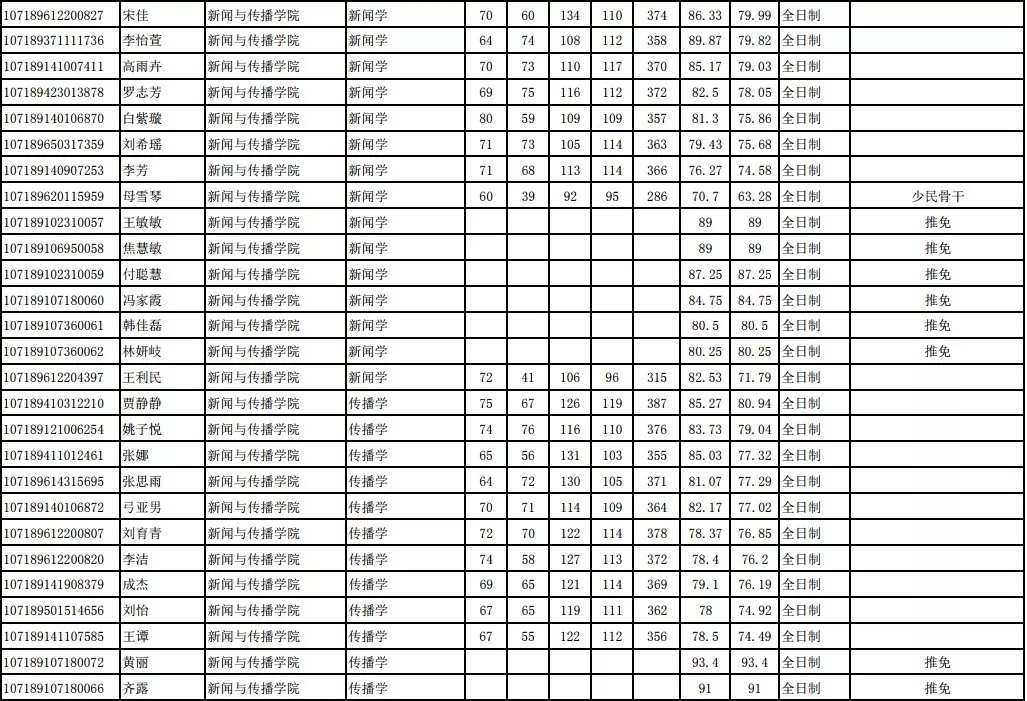 摘要:本文由新祥旭考研吴老师为大家详细解析陕西师范大学新闻传播学考研情况,主要有以下几个板块:陕西师范大学新闻传播学考研考试科目、研究方向介绍、本专业近3年复试分数线对比、本专业近3年报录比情况、本专业考研参考书目、往年录取名单及陕西师范大学备考经验。 一、陕西师范大学新闻传播学考试科目 招生院系:新闻与传播学院 招生专业:新闻学(050301)(学硕) 研究方向: 01新闻理论 02新闻史 03新闻实务 04比较新闻学 招生专业:传播学(050302)(学硕) 研究方向: 01传播理论 02网络与新媒体 03出版与文化产业 04广告学 考试科目: ①101 思想政治理论 ③710 新闻传播理论与历史 ④811 新闻传播实务 二、国家线文学类(A类)分数线 年份 政治 外语 专业课一 专业课二 总分 2019 51 51 77 77 355 2018 55 55 83 83 345 2017 53 53 80 80 345 2016 53 53 80 80 350 2015 52 52 78 78 345 陕西师范大学新闻与传播学院录取情况 年份 报考人数 录取人数 推免 最高分 最低分 平均分 2018 899 129 33 413 337 371 2017 767 118 25 411 338 375 2016 669 119 13 422 308 379 三、陕西师范大学新闻传播学考研参考书(2018官方指定) 710 新闻传播理论与历史 李良荣:《新闻学概论》(第四版),复旦大学出版社2011年版 郭庆光:《传播学教程》(第二版),中国人民大学出版社年2011年版 方汉奇:《中国新闻传播史》,中国人民大学出版社2009年版 杨保军:《新闻理论教程》(第二版),中国人民大学出版社2010年版 811 新闻传播实务 刘海贵:《中国新闻采访写作教程》,复旦大学出版社2008年版 张子让:《当代新闻编辑》,复旦大学出版社2004年版 丁法章:《新闻评论教程》,复旦大学出版社2008年版 四、2019陕西师范大学新闻传播学学硕复试名单 专业 名称 姓名 总分 政治 理论 外国 语 业务课 一 业务课 二 新闻学 宋佳 374 70 60 134 110 新闻学 罗志芳 372 69 75 116 112 新闻学 高雨卉 370 70 73 110 117 新闻学 李芳 366 71 68 113 114 新闻学 刘希瑶 363 71 73 105 114 新闻学 蒙少华 358 68 56 120 114 新闻学 李怡萱 358 64 74 108 112 新闻学 白紫璇 357 80 59 109 109 传播学 贾静静 387 75 67 126 119 传播学 刘育青 378 72 70 122 114 传播学 姚子悦 376 74 76 116 110 传播学 李洁 372 74 58 127 113 传播学 张思雨 371 64 72 130 105 传播学 张静雯 370 66 73 120 111 传播学 成杰 369 69 65 121 114 传播学 弓亚男 364 70 71 114 109 传播学 刘怡 362 67 65 119 111 传播学 李丹雅 361 66 70 122 103 传播学 吴璇 357 68 68 110 111 传播学 王谭 356 67 55 122 112 传播学 张晗 356 68 67 113 108 传播学 张娜 355 65 56 131 103 2019新闻传播学学硕拟录取名单 五、陕西师范大学新闻传播学考研复习经验
