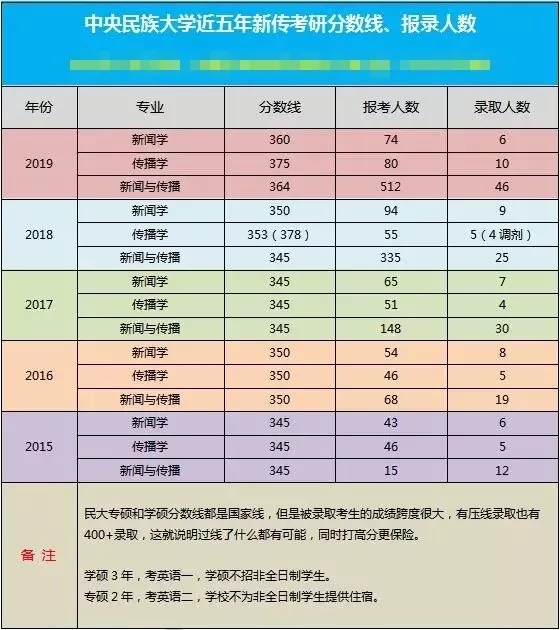 备注:不招收同等学力考生 二、国家线文学类(A类)复试分数线 年份 政治 外语 专业课一 专业课二 总分 2019 51 51 77 77 355 2018 55 55 83 83 345 2017 53 53 80 80 345 2016 53 53 80 80 350 2015 52 52 78 78 345 中央民族大学新闻传播学录取情况 三、中央民族大学新闻传播学考研参考书(仅供参考) 《传播学教程》(第二版),郭庆光,中国人民大学出版社 《网络传播概论》(第四版),彭兰,中国人民大学出版社 《新媒体前沿:人工智能与虚拟现实》,胡正荣,周婷,社会科学文献出版社 《新闻学概论》(第六版),李良荣,复旦大学出版社 《新编广播电视新闻学》(第三版),吴信训,复旦大学出版社 《广告策划》(第三版),黄升民,段晶晶,中国传媒大学出版社 《现代广告学概论》(第四版),陈培爱,首都经济贸易大学出版社 《中国新闻传播史》,方汉奇,中国人民大学出版社 《外国新闻传播史》,程曼丽 , 中国人民大学出版社 《新闻采访》,熊高、熊倩,中国传媒大学出版社 《新闻写作教程》,刘明华、徐泓、张征,中国人民大学出版社 《新闻编辑》,马工程,高等教育出版社 《新闻评论》,李舒,中国人民大学出版社 《网络新闻编辑》(修订),邓炘炘,中国广播电视出版社 《公共关系学》,胡百精,中国人民大学出版社 四、2019中央民族大学文学与新闻传播学院复试安排
