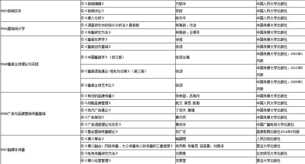 摘要:本文由新祥旭考研吴老师为大家详细解析中国传媒大学新闻与传播专硕考研情况,主要有以下几个板块:中国传媒大学新闻与传播专硕考研考试科目、研究方向介绍、本专业近3年复试分数线对比、本专业近3年报录比情况、本专业考研参考书目、往年录取名单及中国传媒大学备考经验。 一、中国传媒大学新闻与传播考试科目 招生专业:新闻与传播(055200)(专硕) 招生人数:统招40人,推免10人 研究方向: 01新闻实务 02媒体市场研究 03国际新闻与传播 04电视新闻采编 05新媒体采编实务 06体育新闻与传播 07口语传播实务 08品牌营销传播 09融媒体传播 10国际广播电视(中外合作办学项目) 考试科目: ①101 思想政治理论 ②204 英语二或202俄语或203日语 ③334 新闻与传播专业综合能力 ④440 新闻与传播专业基础 注:10方向为中外合作办学项目,报考要求见2018年招生简章。本方向不接收推免生 二、中国传媒大学新闻与传播分数线 2019 2018 2017 三、中国传媒大学新闻与传播考研参考书(仅供参考)