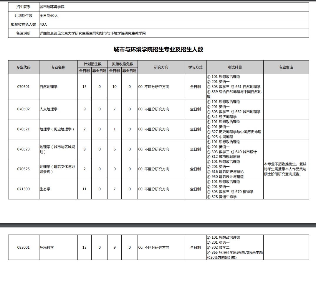 最新!2020年北京大学环境与城市学院研究生招生专业目录公布!