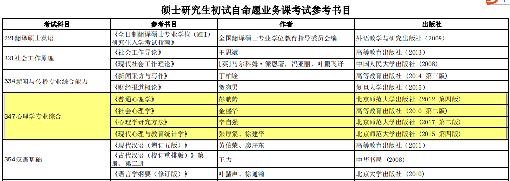 101思想政治理论 /204英语二 /347心理学专业综合