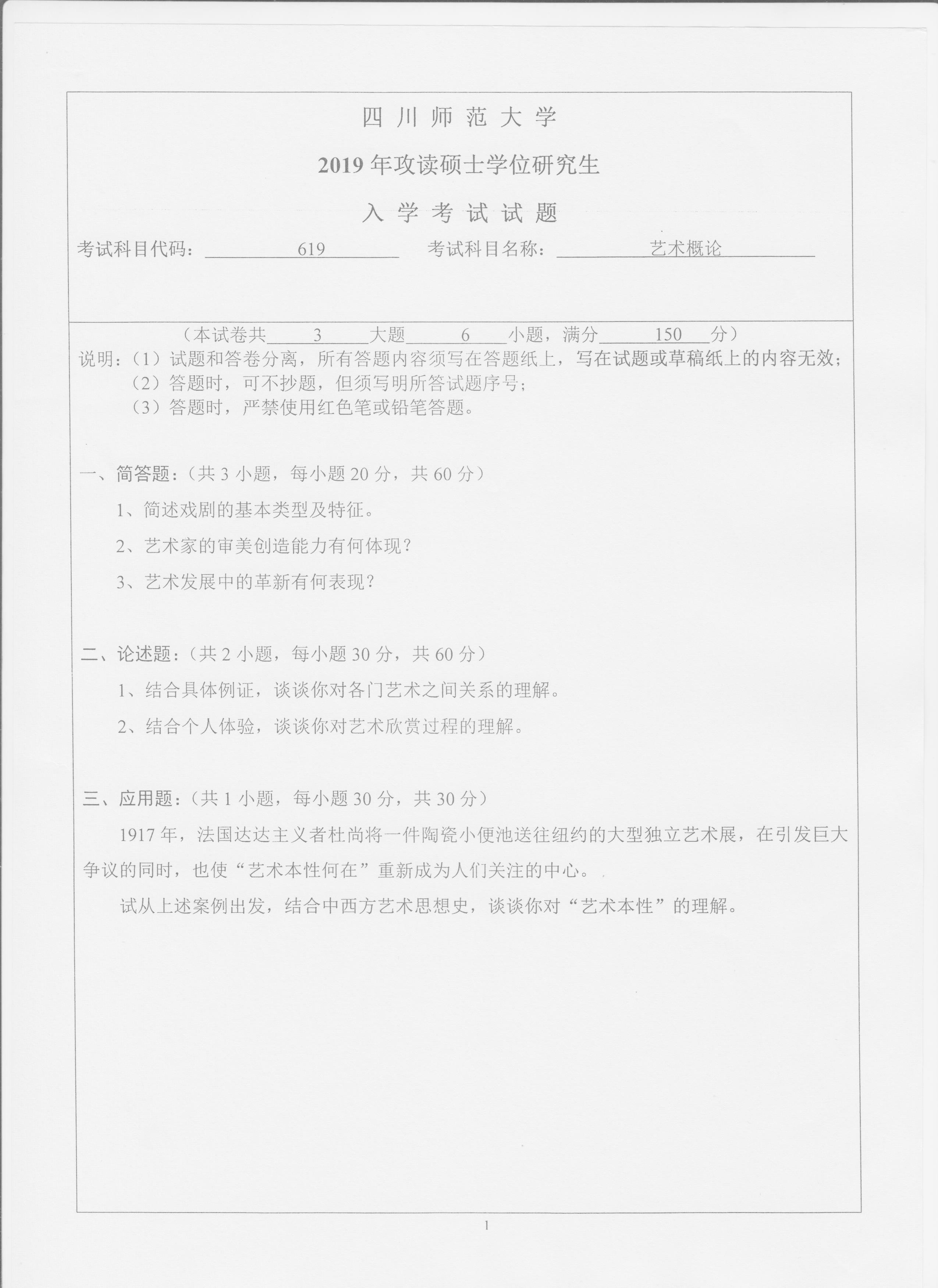2019年四川师范大学艺术学原理619艺术概论考研真题完整版--新祥旭