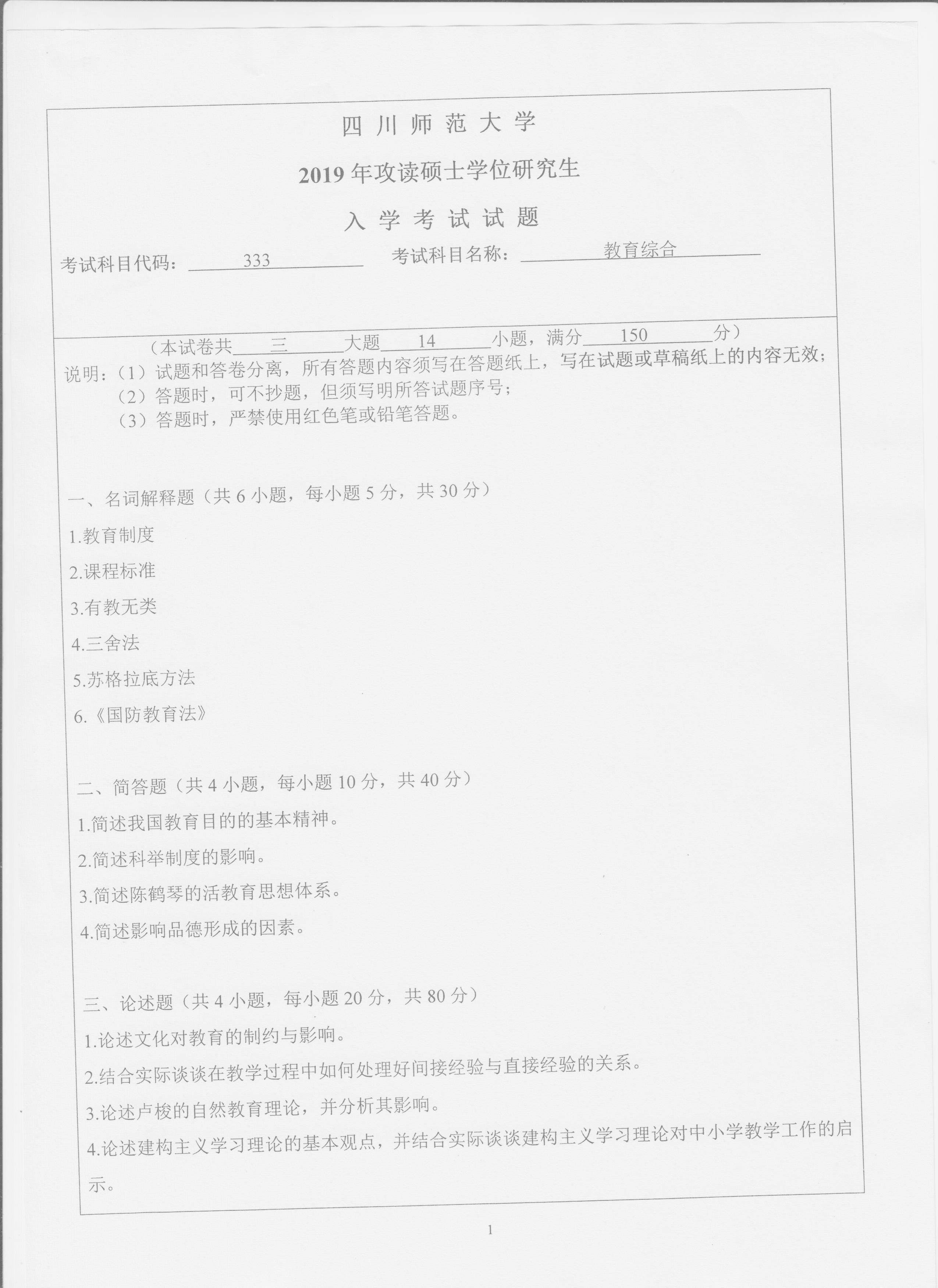 2019年四川师范大学333教育综合考研真题完整版--新祥旭