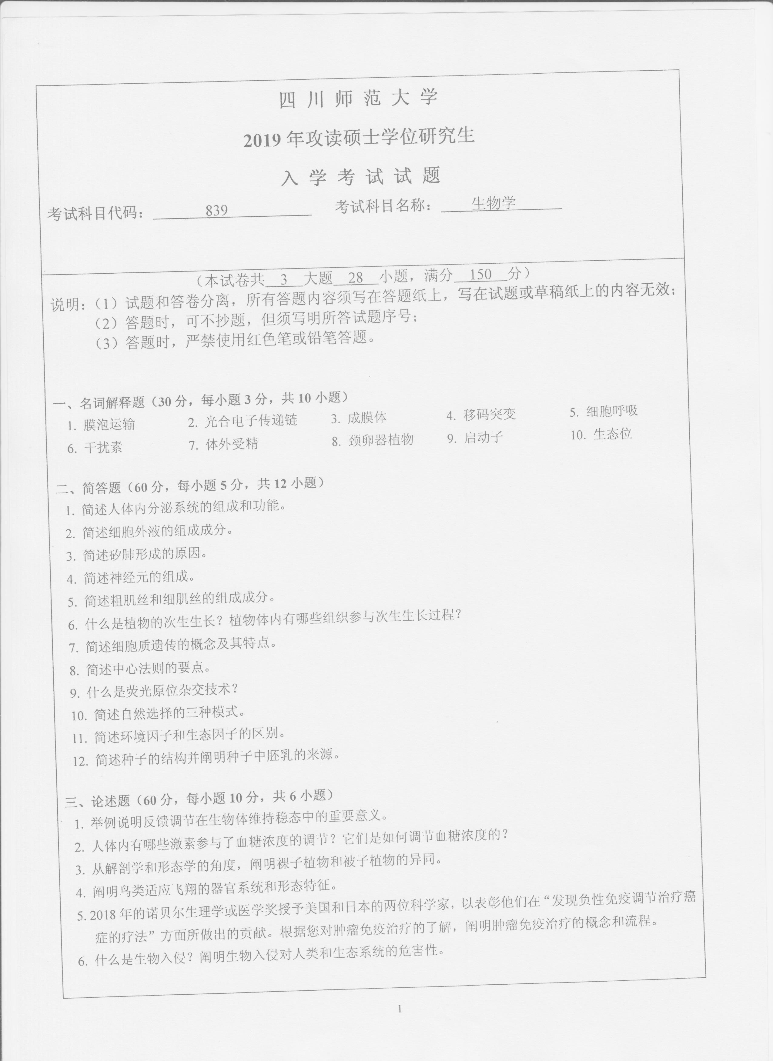 新祥旭考研--2019年四川师范大学学科教学生物839考研真题完整版