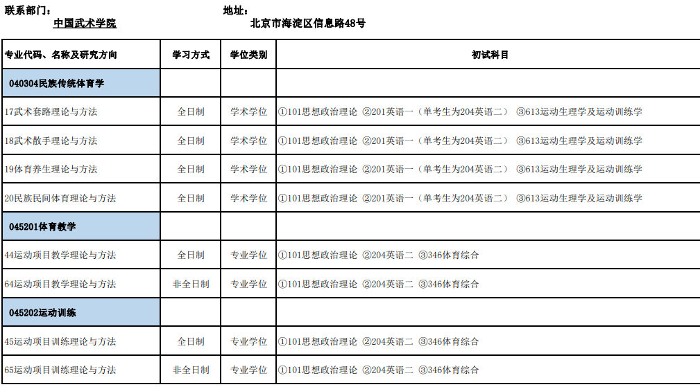 北京体育大学考研辅导班:北体中国武术学院2020年考研招生目录
