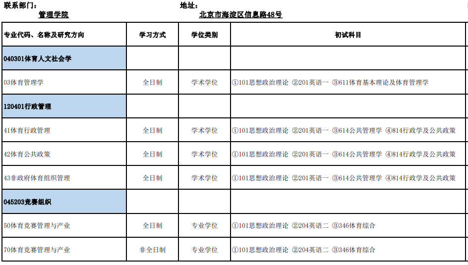 北京体育大学考研辅导班:北体管理学院2020年考研招生目录