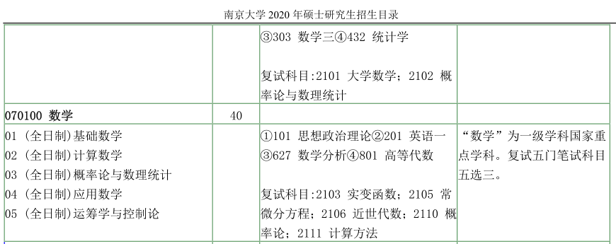 南京大学考研辅导班:南京大学数学系2020年硕士研究生招生目录