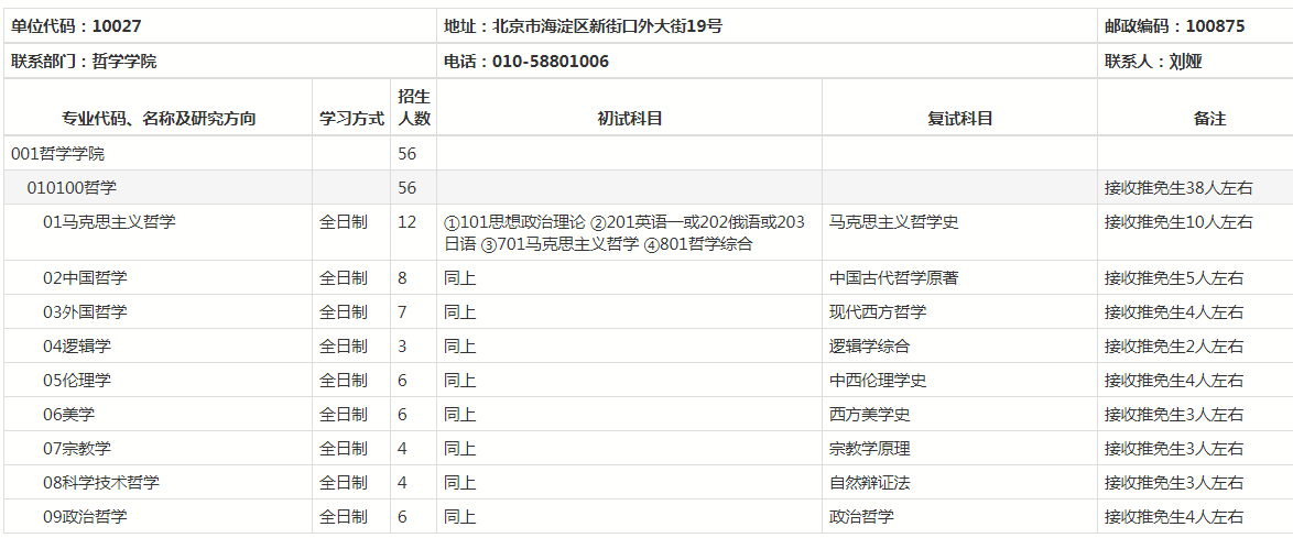 北师大考研辅导班:北师大哲学学院2020年硕士研究生招生专业、考试科目、招生人数一览表