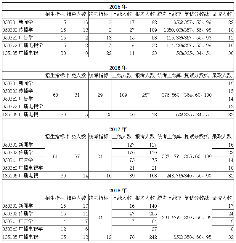 【学硕】学硕方面,统招人数很少,每年在25人上下浮动,而且还是新闻学、传播学、广告学、广播电视四个方向共分这25个名额,竞争很激烈。