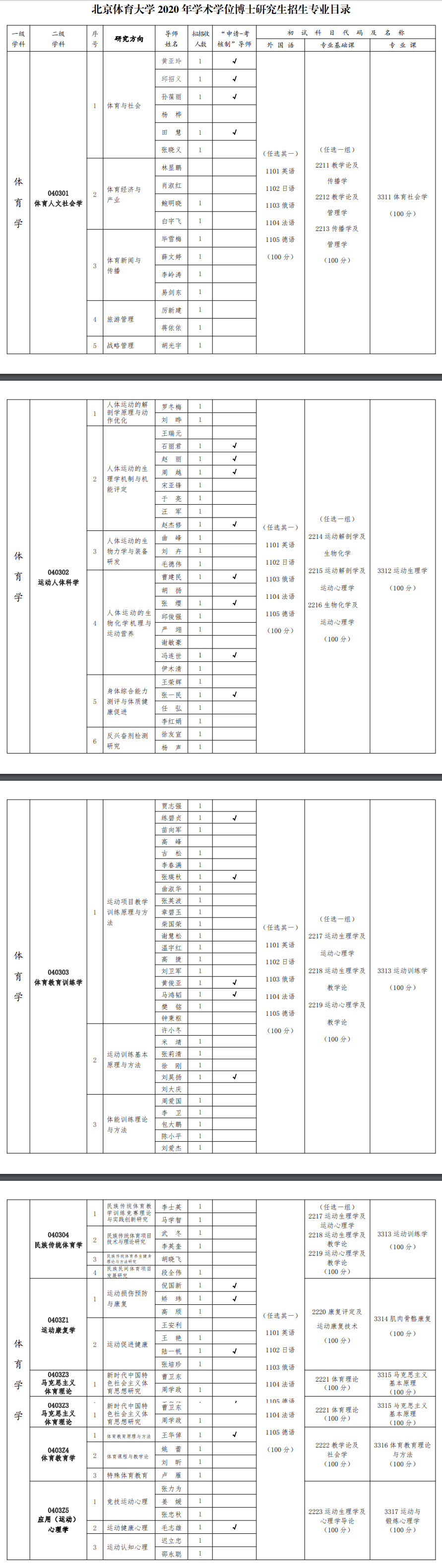 北体考研辅导班:北京体育大学2020年学术学位博士研究生招生专业考试目录及招生人数