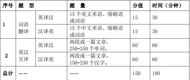 汉译英为 150-250 个汉字,各占 60 分。总分 150 分。考试时间为 180 分钟。