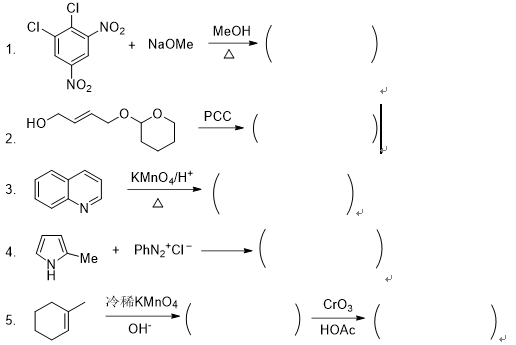 12. 苯甲醛为无色液体,长期暴露在空气中会慢慢变为白色结晶,发生的反应是 ( ) A. 自由基氧化反应 B. 离子型加成反应 C. 氧化还原反应 D. 协同反应 13. 1 g下列化合物加到10 ml水中, 分层并浮在上面的有 ( ) A. 吡啶和甘油 B. 己烷和乙醚 C. 乙醇和乙酸 D. 氯仿和丁醛 14. Claisen酯缩合经常用来制备 ( ) A. b-羟基酯 B. d-羟基酯 C. b-酮基酯 D. d-酮基酯 15. 下列化合物沸点最低的是 ( ) A. 正丁烷 B. 2-氯丁烷 C. 正丁酮 D. 乙醚 16. 含有硫原子的氨基酸是 ( ) A. 蛋氨酸 B. 甘氨酸 C. 半胱氨酸 D. 丝氨酸 17. 芳香族伯胺的重氮化反应是在 ( ) 溶液中进行 A. 弱酸性 B. 碱性 C. 中性 D. 强酸性 18. 可以进行Cannizarro反应的化合物是 ( ) A. 甲醛 B. 丙醛 C. 糠醛 D. 2,2-二甲基丁醛 19. 烷烃进行卤代反应的中间体是 ( ) A. 碳正离子 B. 自由基 C. 碳负离子 D. 碳烯 20. 甲烷分子的空间构型以及碳原子的杂化类型是 ( ) A. 四方椎体,sp3杂化 B. 三角椎体,sp2杂化 C. 正四面体,sp2杂化 D. 正四面体,sp3杂化 二、完成如下反应,写出主要产物(14小题,每空3分,共60分)