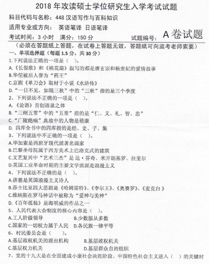 河师大考研辅导班:2018年河南师范大学翻译硕士考研448汉语写作与百科知识真题