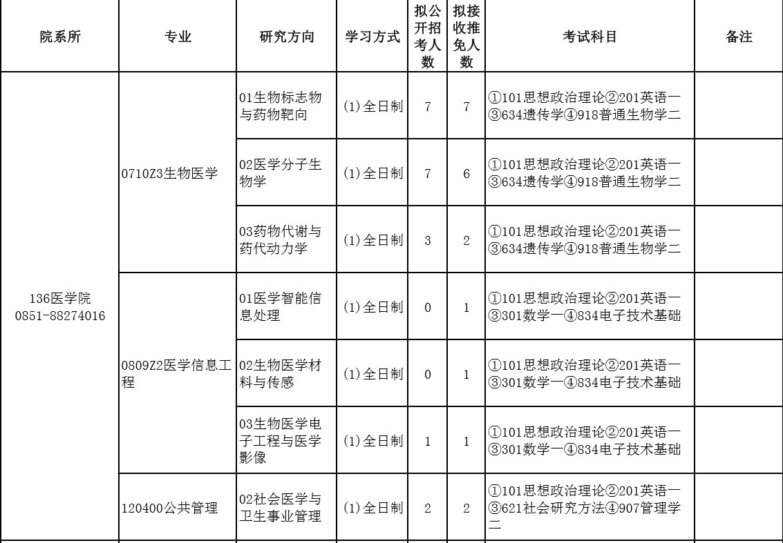 贵州大学考研辅导班:2020贵州大学医学院研究生专业目录、招生人数、考试科目