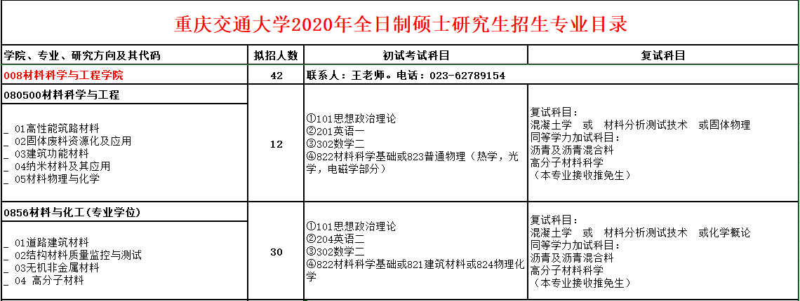 重庆交大考研辅导班:2020年重庆交通大学材料科学与工程学院考研招生专业目录