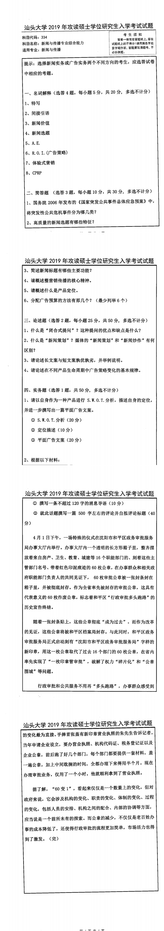汕头大学考研辅导班:2019年汕头大学考研334新闻与传播专业综合能力真题
