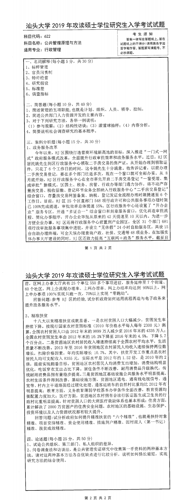 汕头大学考研辅导班:2019年汕头大学考研622公共管理原理与方法真题