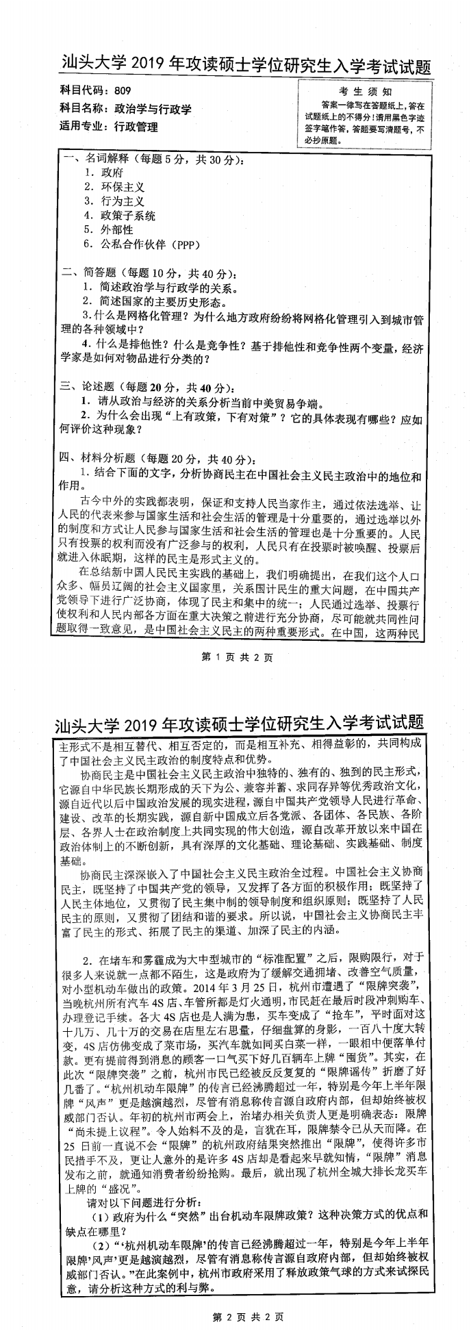 汕头大学考研辅导班:2019年汕头大学考研809政治学与行政学真题