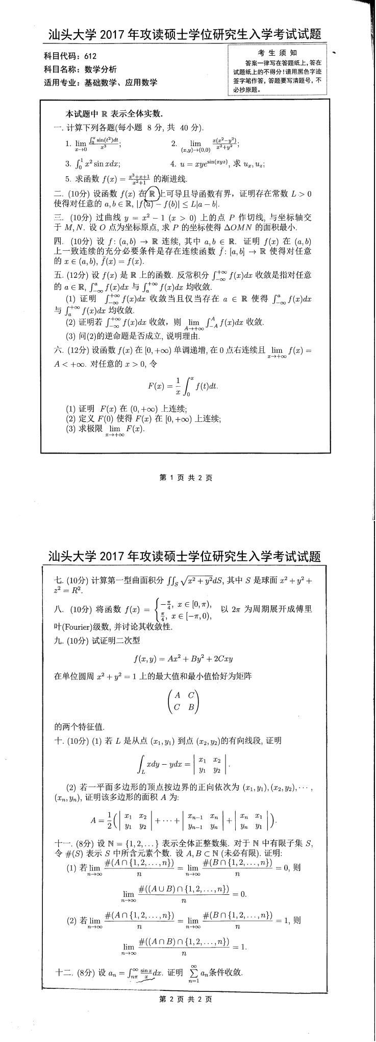 汕头大学考研辅导班:2017年汕头大学考研612数学分析真题