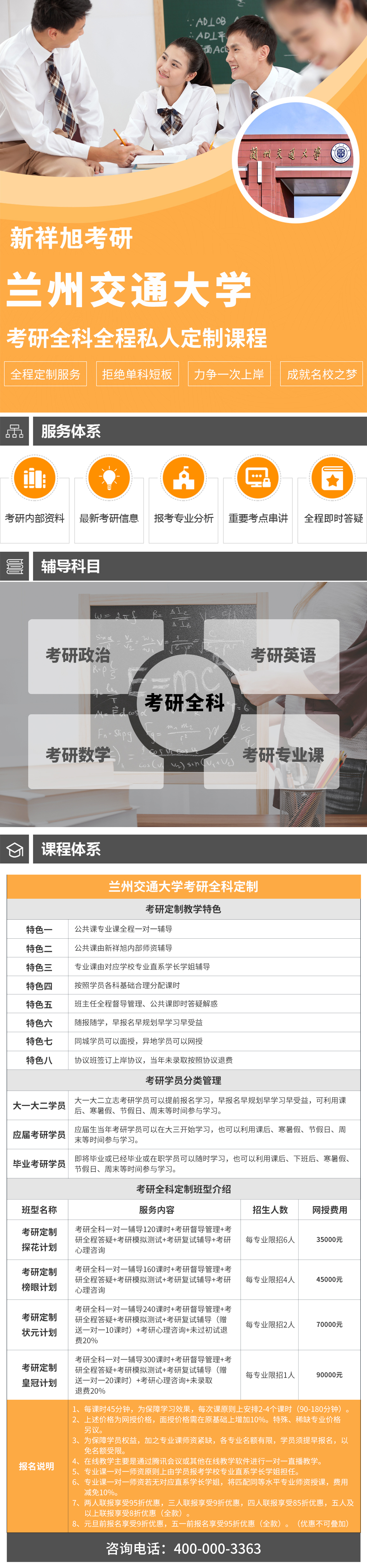 课程描述:新祥旭考研专注兰州交通大学考研全科定制辅导,以效果为导向,以上岸为目标,为广大考研学生提供个性化、定制化、多对一的考研全科全程辅导,考研公共课和考研专业课皆为一对一辅导,全国各地考研学生可以面授也可以网授,力争让考研学生顺利考取兰州交通大学攻读硕士研究生。